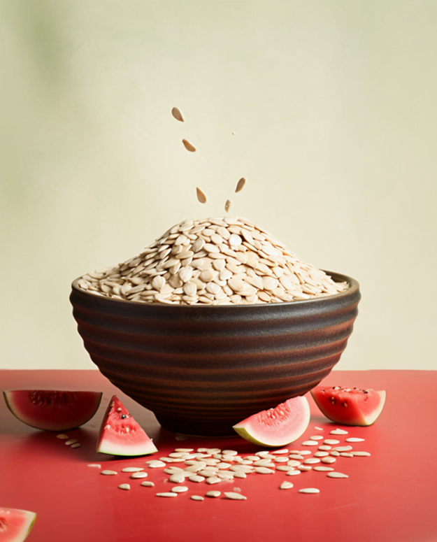 For their distinctive and alluring sensory experience, these little watermelon seeds, with a glossy appearance and a smooth and crunchy texture, are consumed in various cultures and cuisines. To get outstanding flavor and texture, roast it, add some spice, and eat it as a snack. Alternatively, grind it into a powder and use it to coat food or add it to bakery treats.